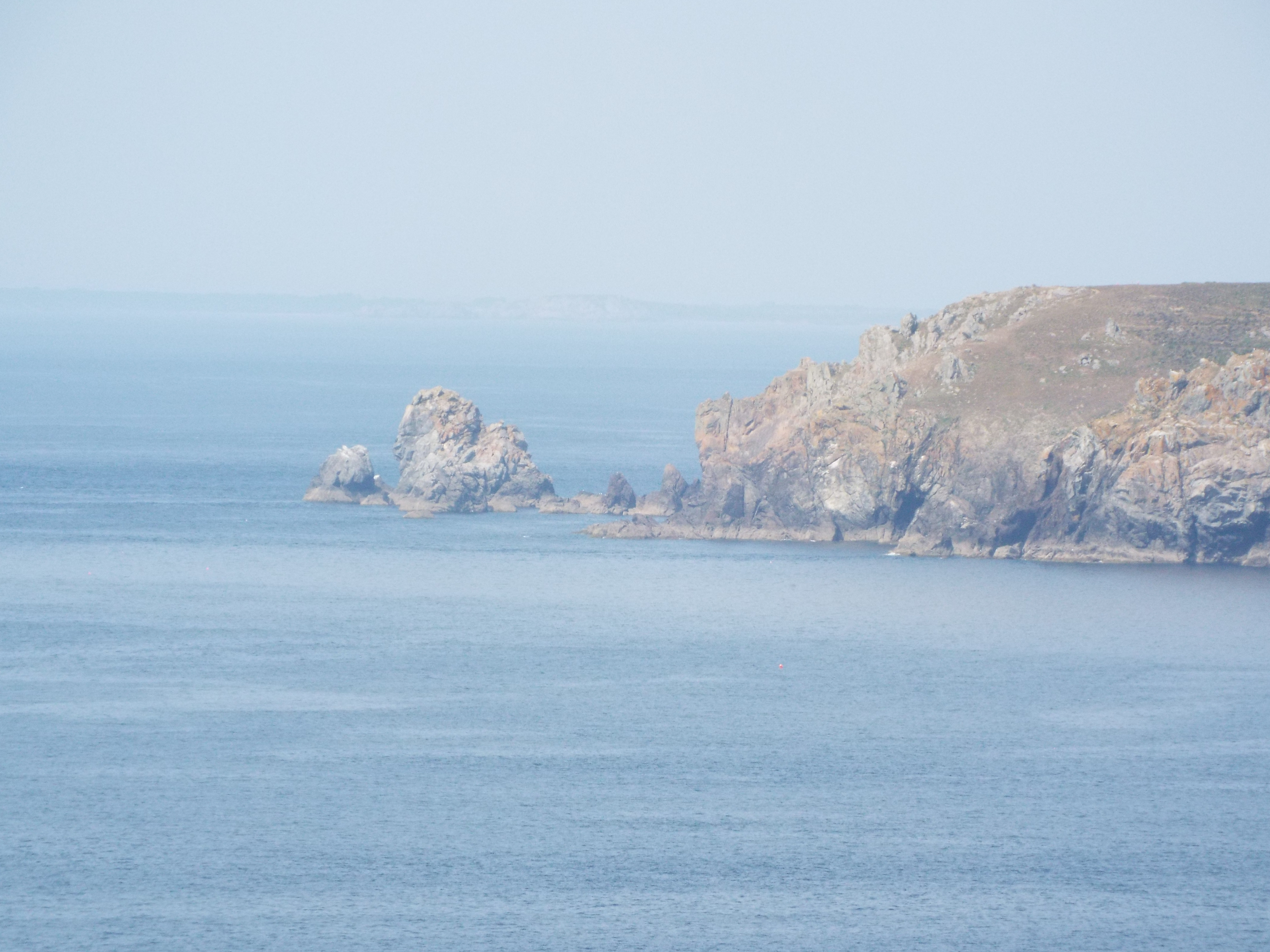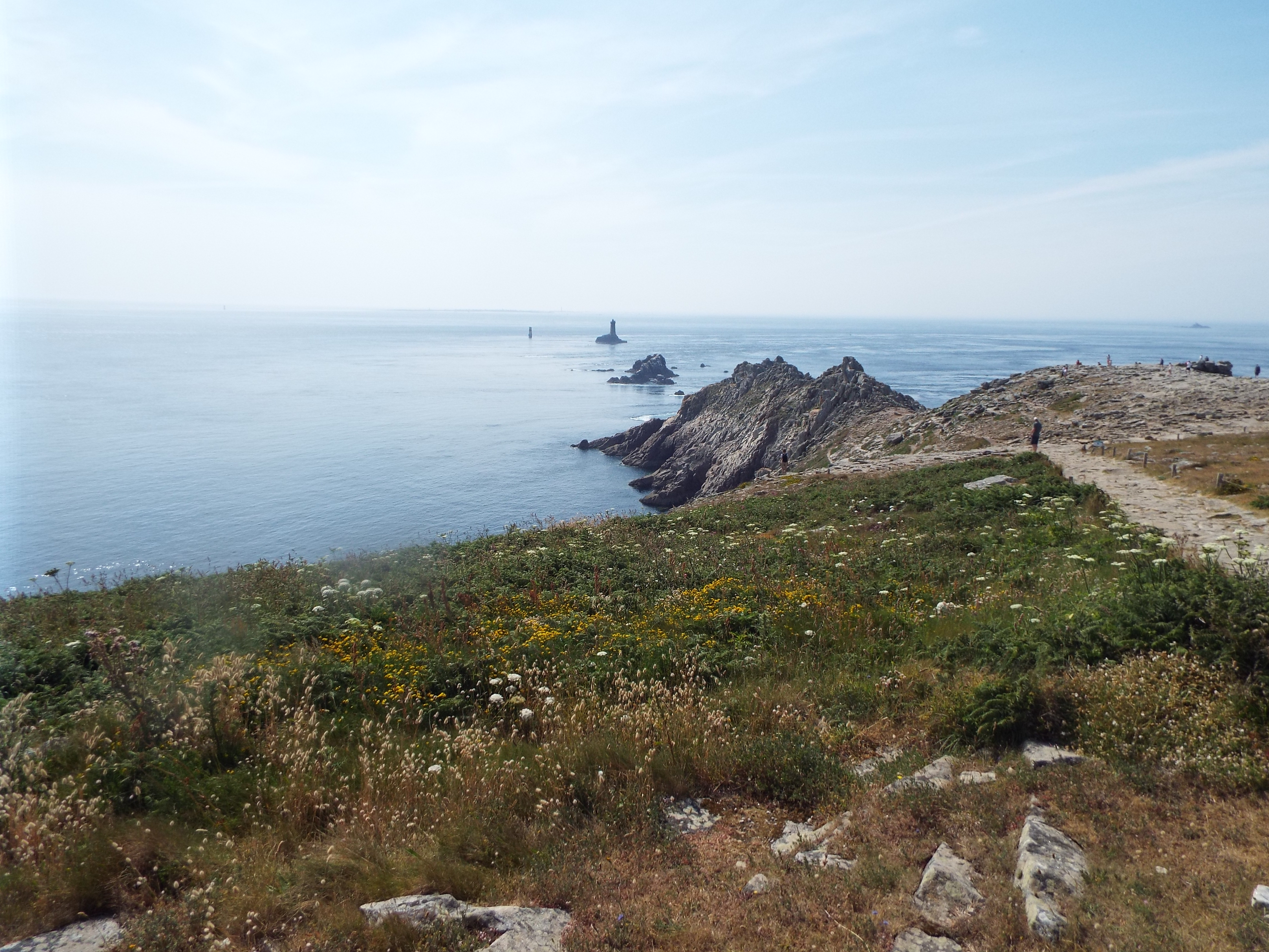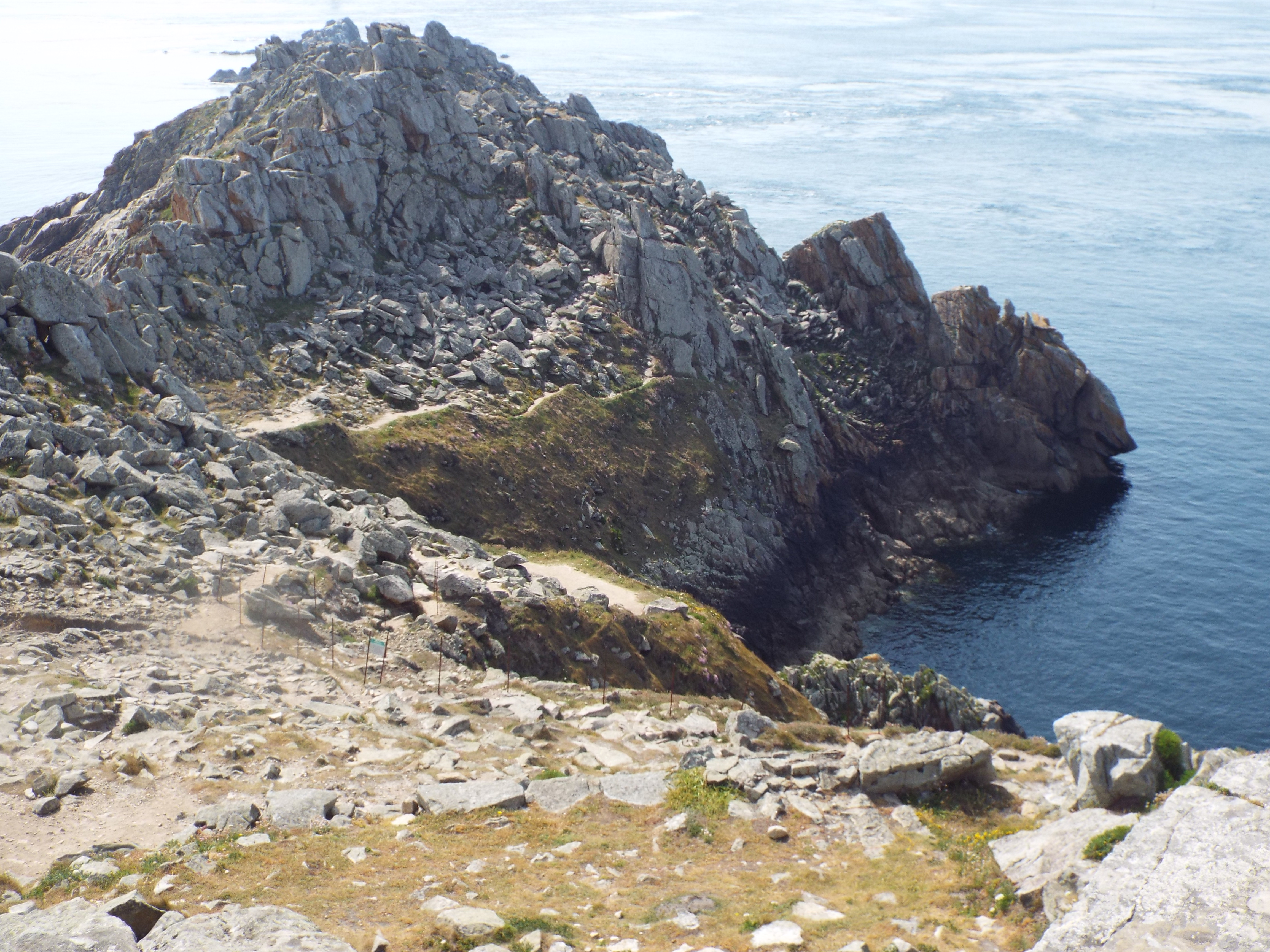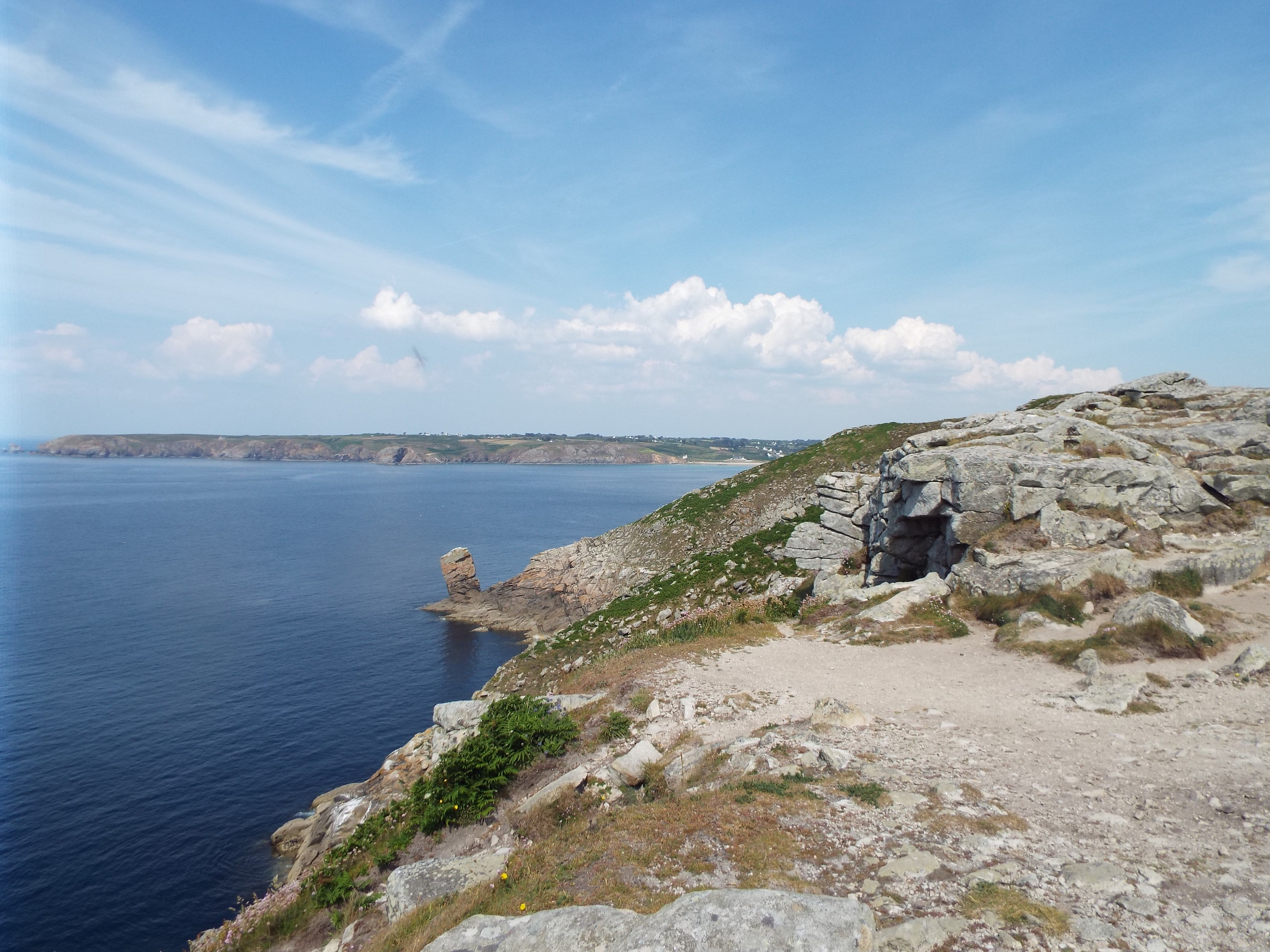After we left Quimper, we visited Pointe du Raz. This is a promontory at the westernmost tip of Brittany. It is a wild area and is styled as one of the "Grand Sites du France", something like a national park in the US. There is a visitor's center and some hiking trails along the coast. Otherwise, it is as nature left it. Nature left it well blessed. It has beatiful vistas everywher and the trail runs by all of them. We made a four mile hike along this trail although we could have gone much further. As I mentioned in an earlier post, there is a trail which goes all around the peninsula, and beyond. I understand it covers the entire Atlantic coast of France. This is a part of that trail. France, like most of Europe, has many hiking trails. GPS: N 48 2.376 W 4 44.207 |