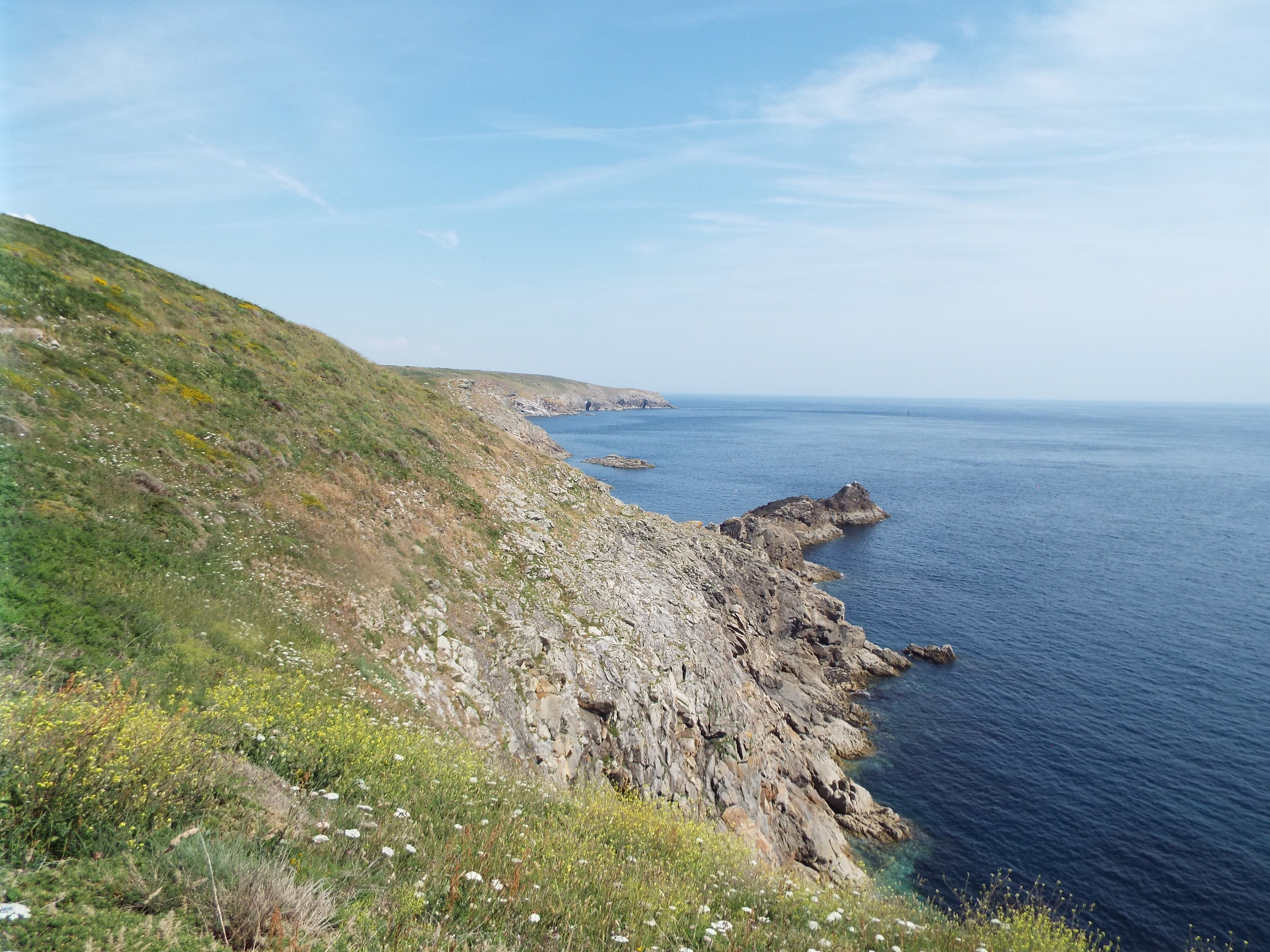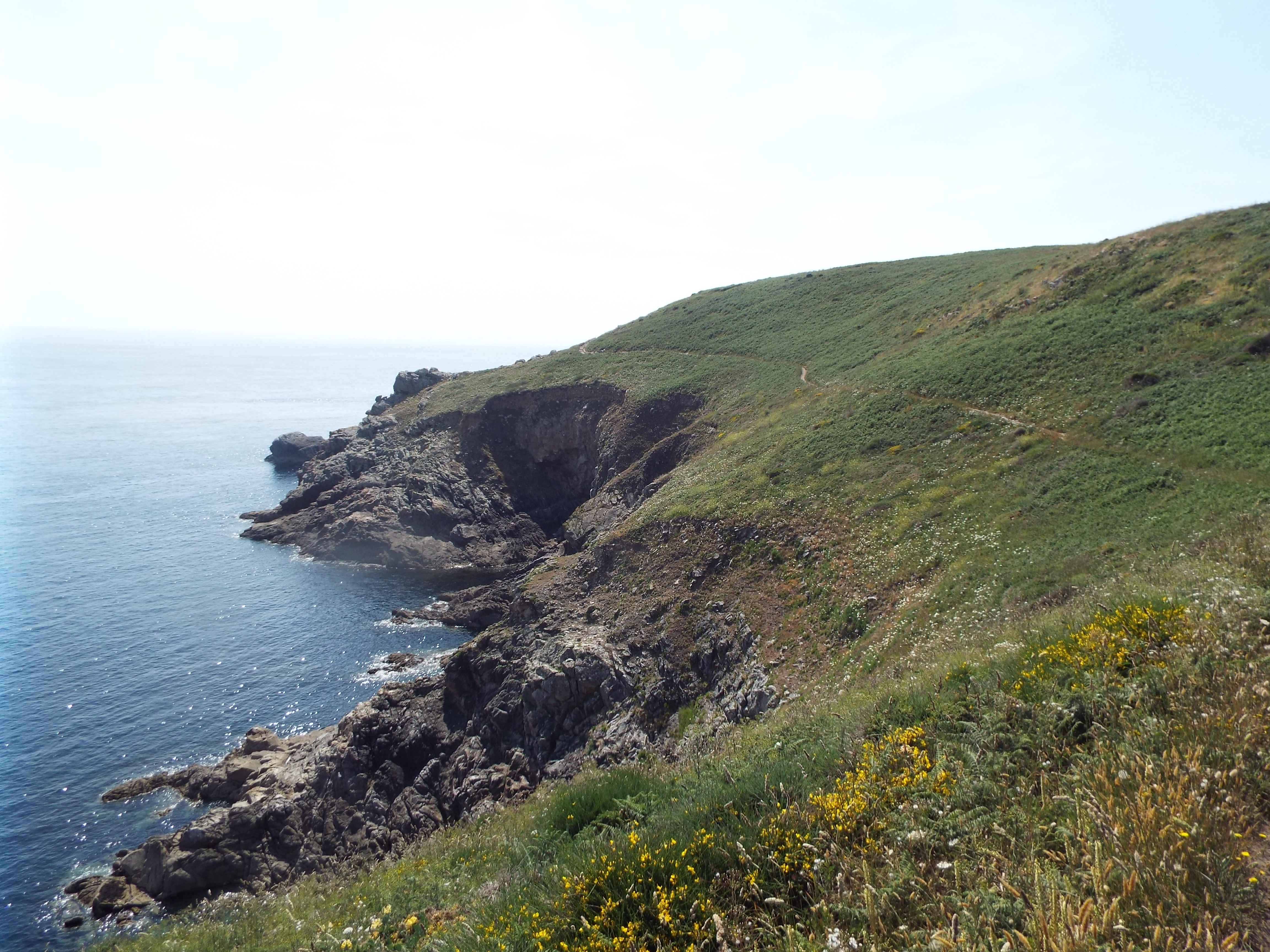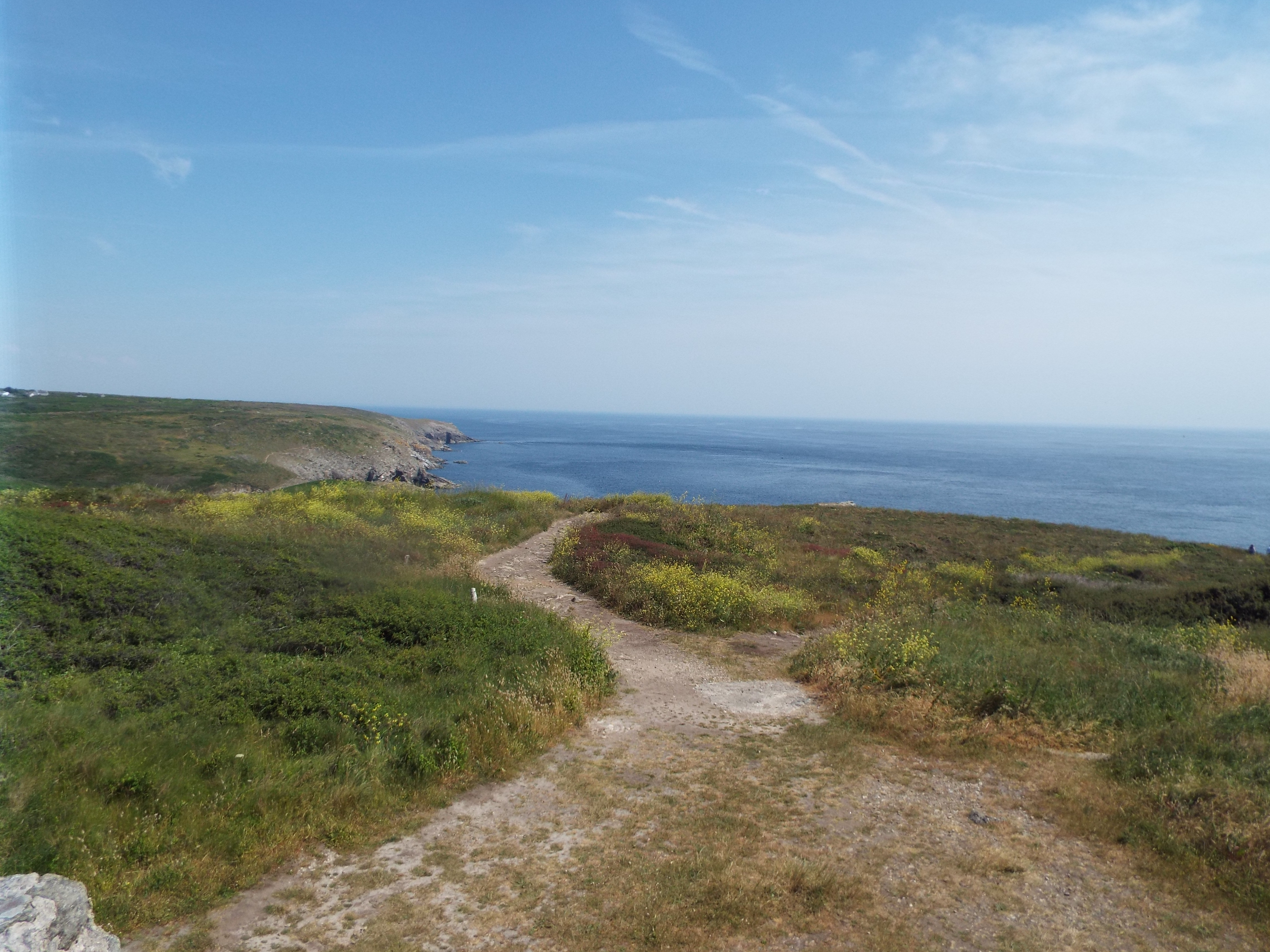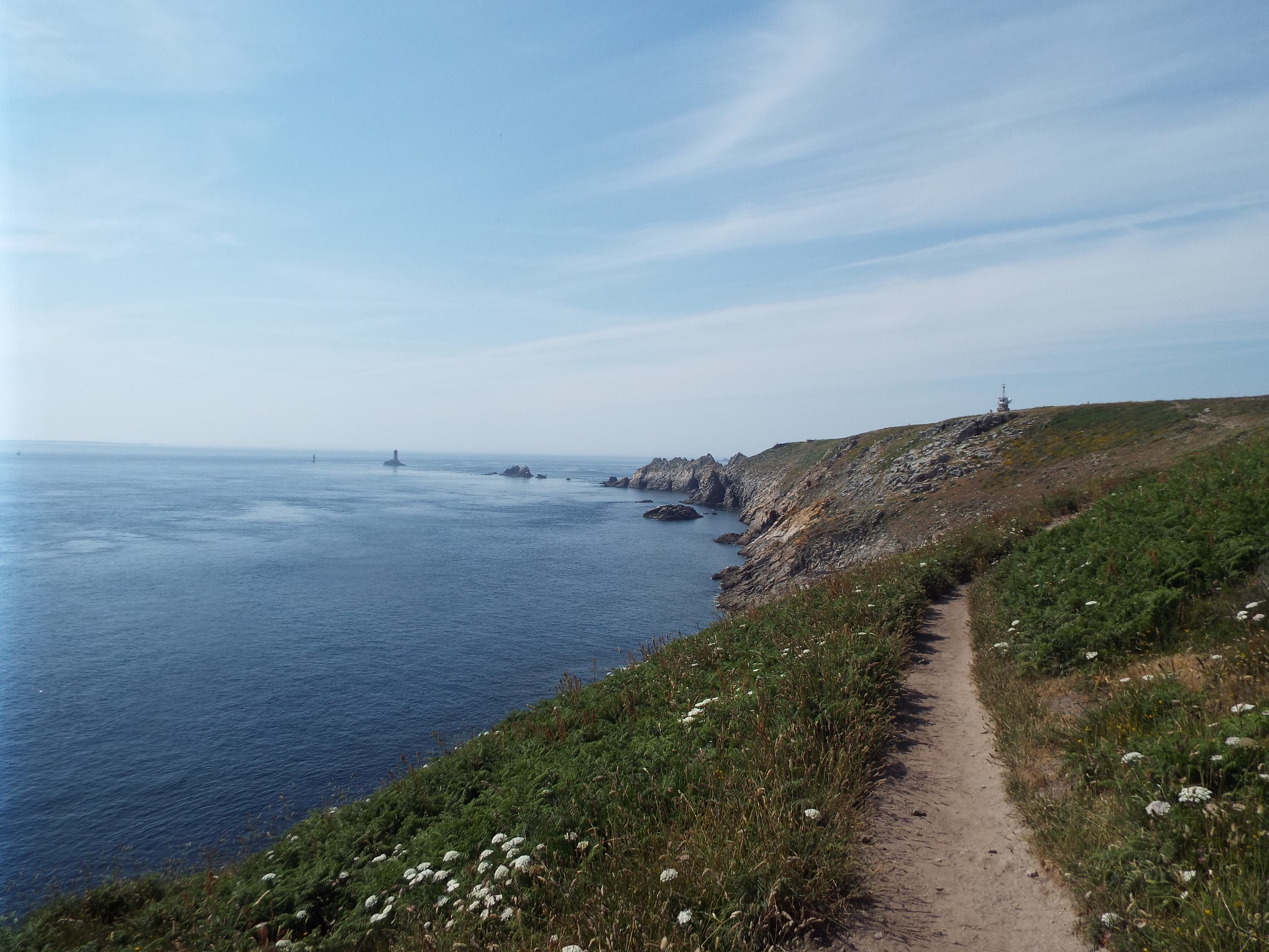 After we left Quimper, we visited Pointe du Raz. This is a promontory at the westernmost tip of Brittany. It is a wild area and is styled as one of the "Grand Sites du France", something like a national park in the US. There is a visitor's center and some hiking trails along the coast. Otherwise, it is as nature left it. Nature left it well blessed. It has beatiful vistas everywher and the trail runs by all of them. We made a four mile hike along this trail although we could have gone much further. As I mentioned in an earlier post, there is a trail which goes all around the peninsula, and beyond. I understand it covers the entire Atlantic coast of France. This is a part of that trail. France, like most of Europe, has many hiking trails. GPS: N 48 2.376 W 4 44.207 |